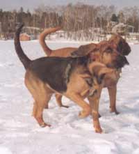 A powerful hound built for manhunting. He as the most remarkable scenting ability. He has a rather solom expression and thin loose skin. Gently treatment is needed with this rather sensitive dog. They require a lot of exercise and training to get the best from them. The coat is short and flat.