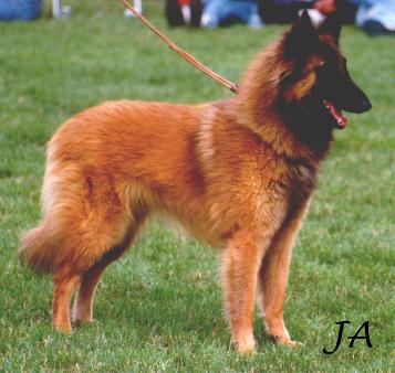 The Belgian Shepherd dog - Tervueren is medium sized, alert and attentive, he gives the impression of grace and strength. With square build and finely chiselled head, medium length undocked tail and moderate spring of rib. Should never be aggressive or timid. The top coat of this variety is long and abundant with a dense undercoat.